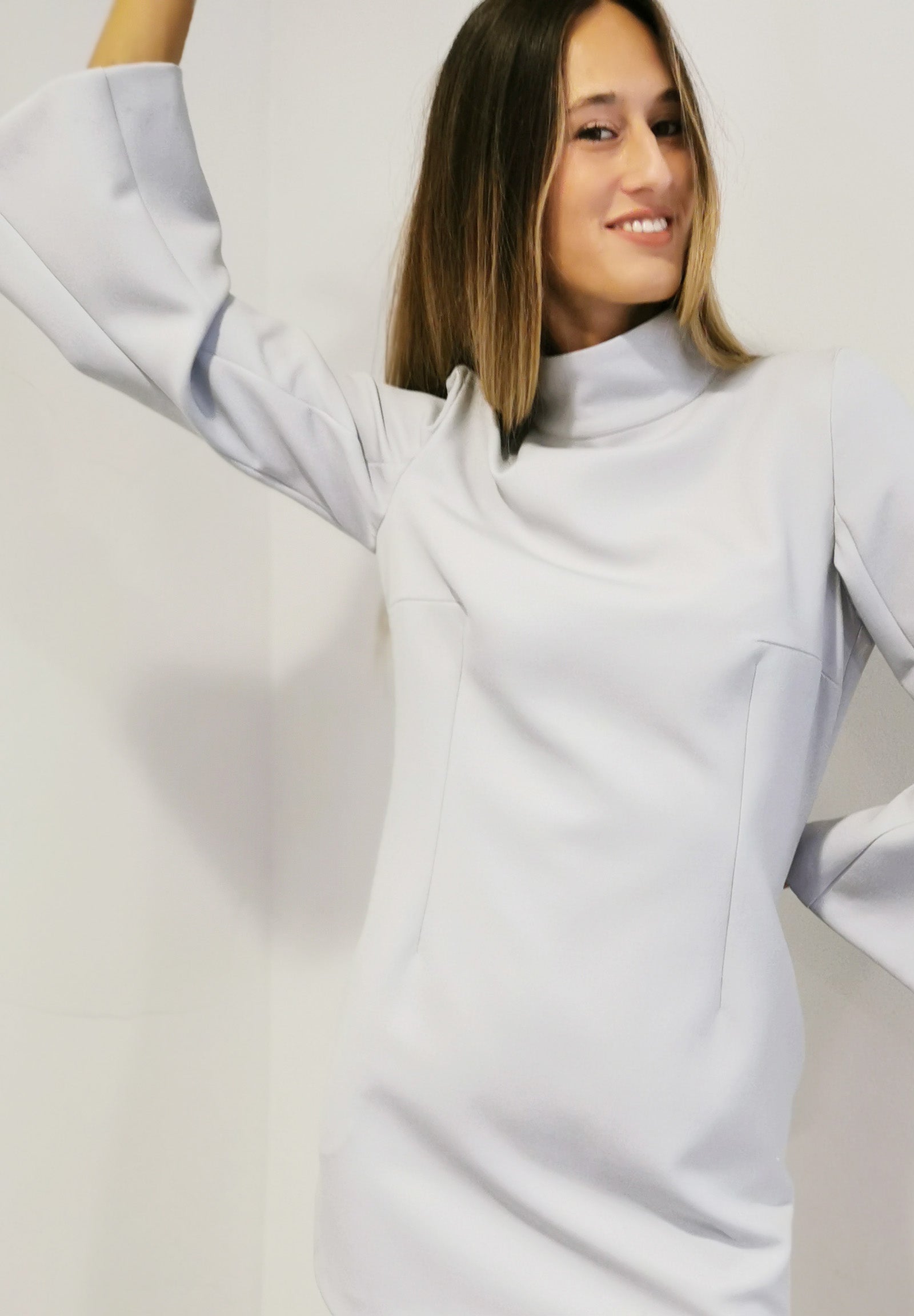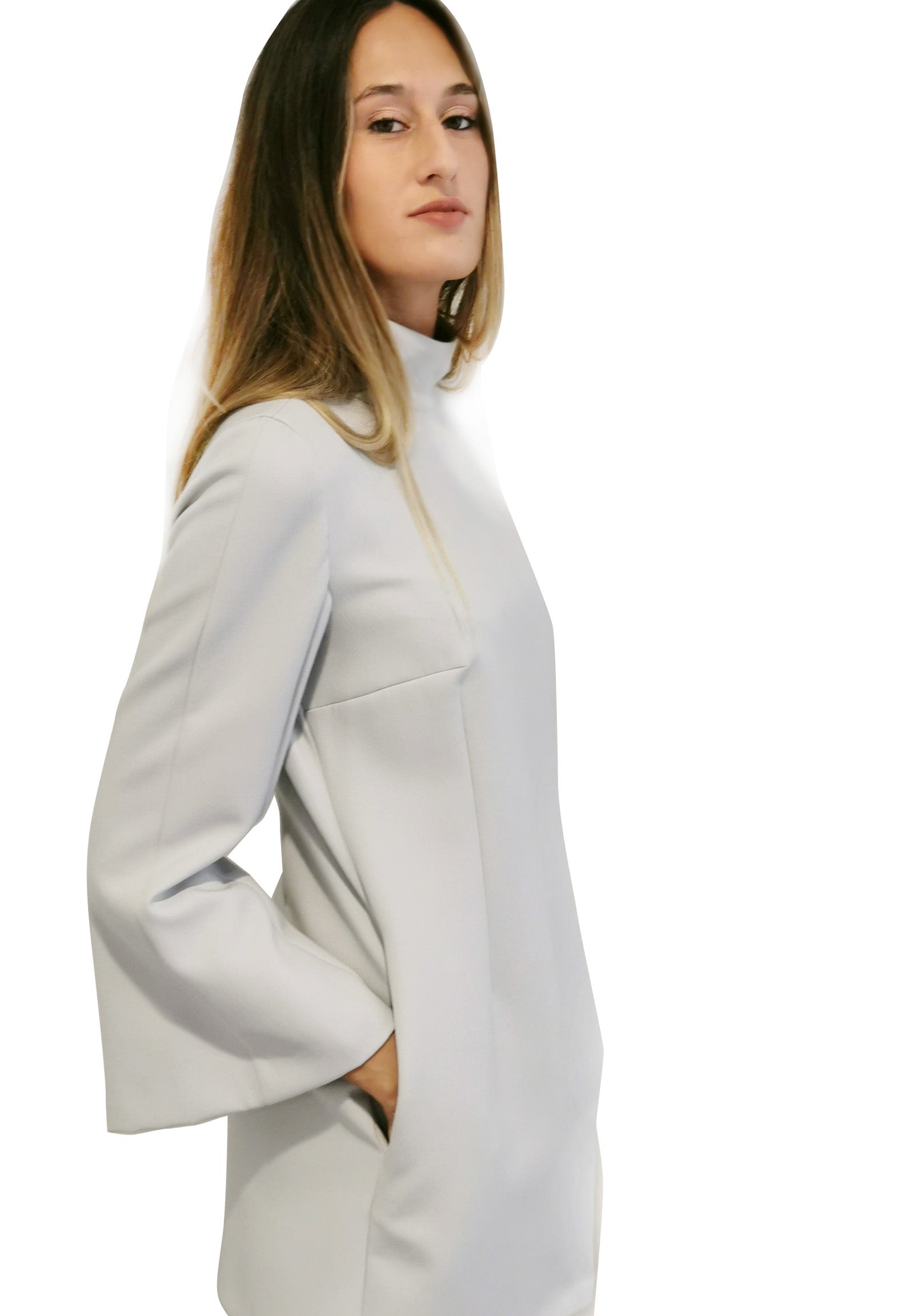 Abito svasato dalla linea semplice e molto ben costruita. Particolari il collo alto, le maniche svasate e le tasche in cucitura