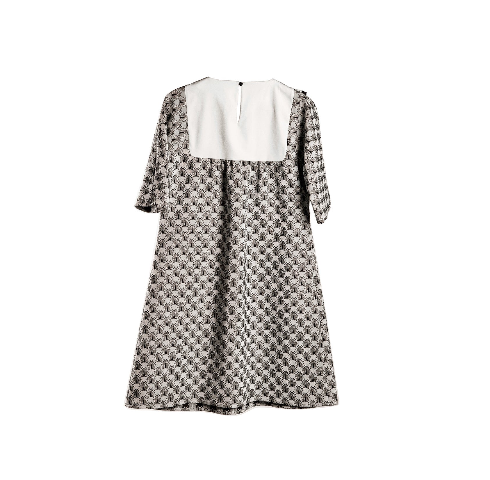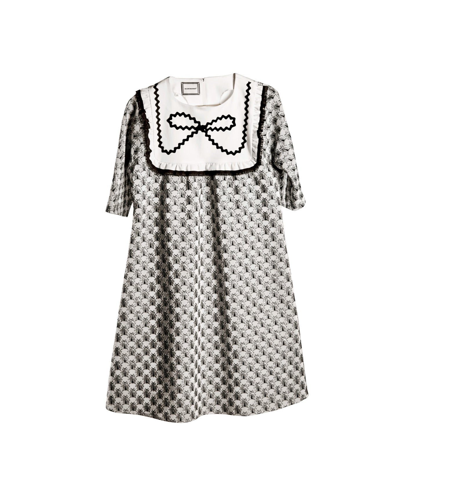 Abito bicolore svasato in tessuto jacquard con pettorina a contrasto bianca con rouge nera e fiocco in passamaneria nero cucito a mano