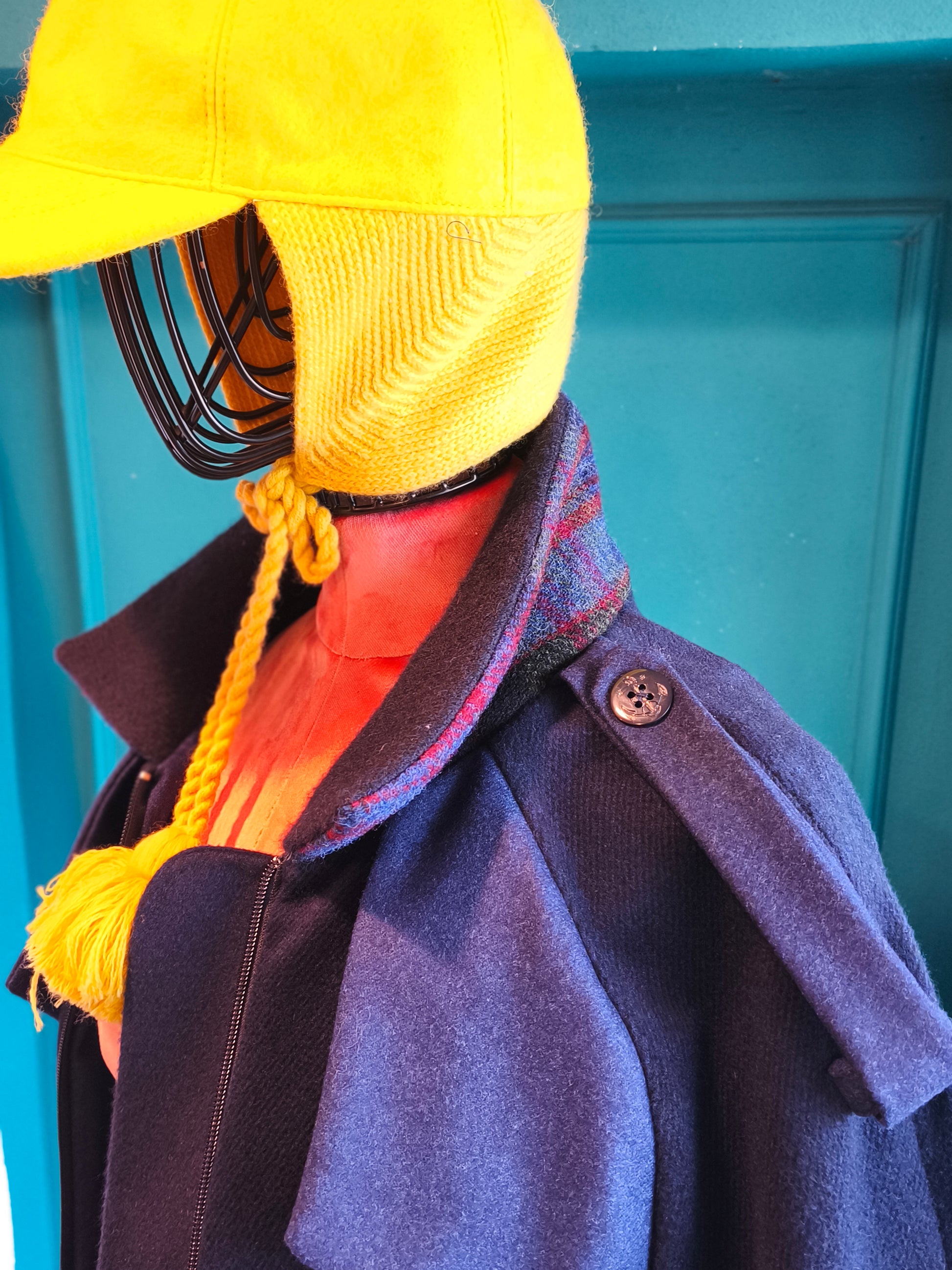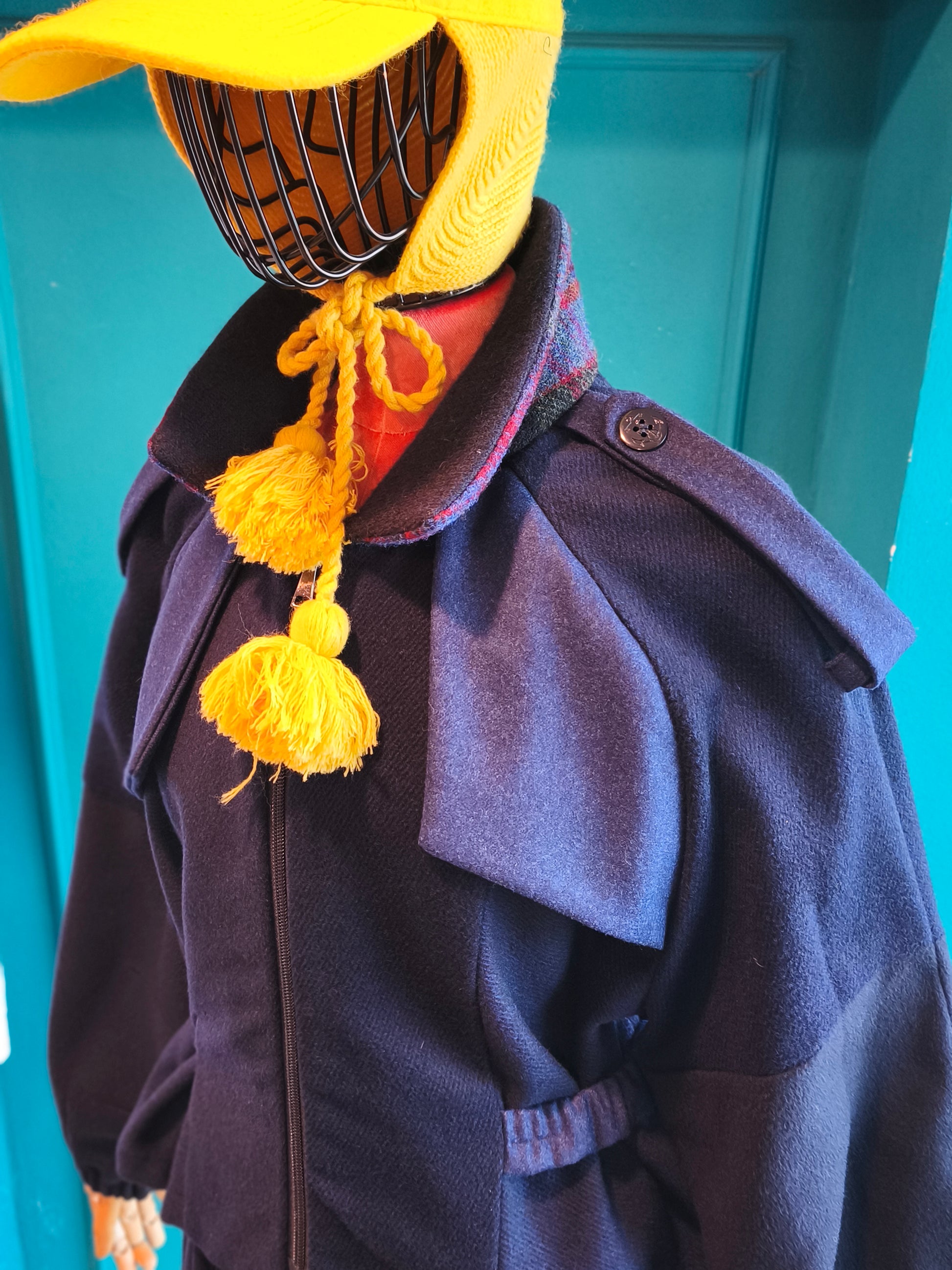 Questo pezzo unico è realizzato con un mix di pregiati cachemire blu e lane inglesi fantasia per i dettagli.