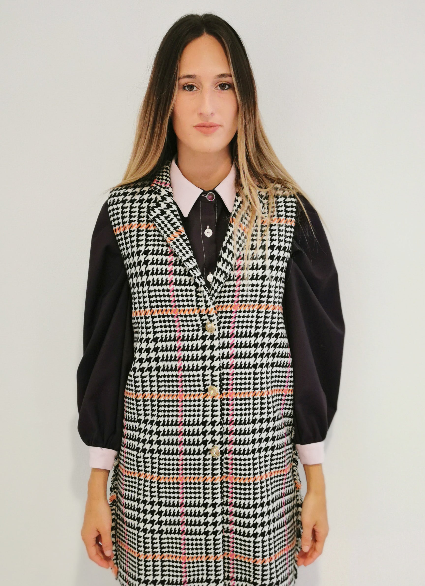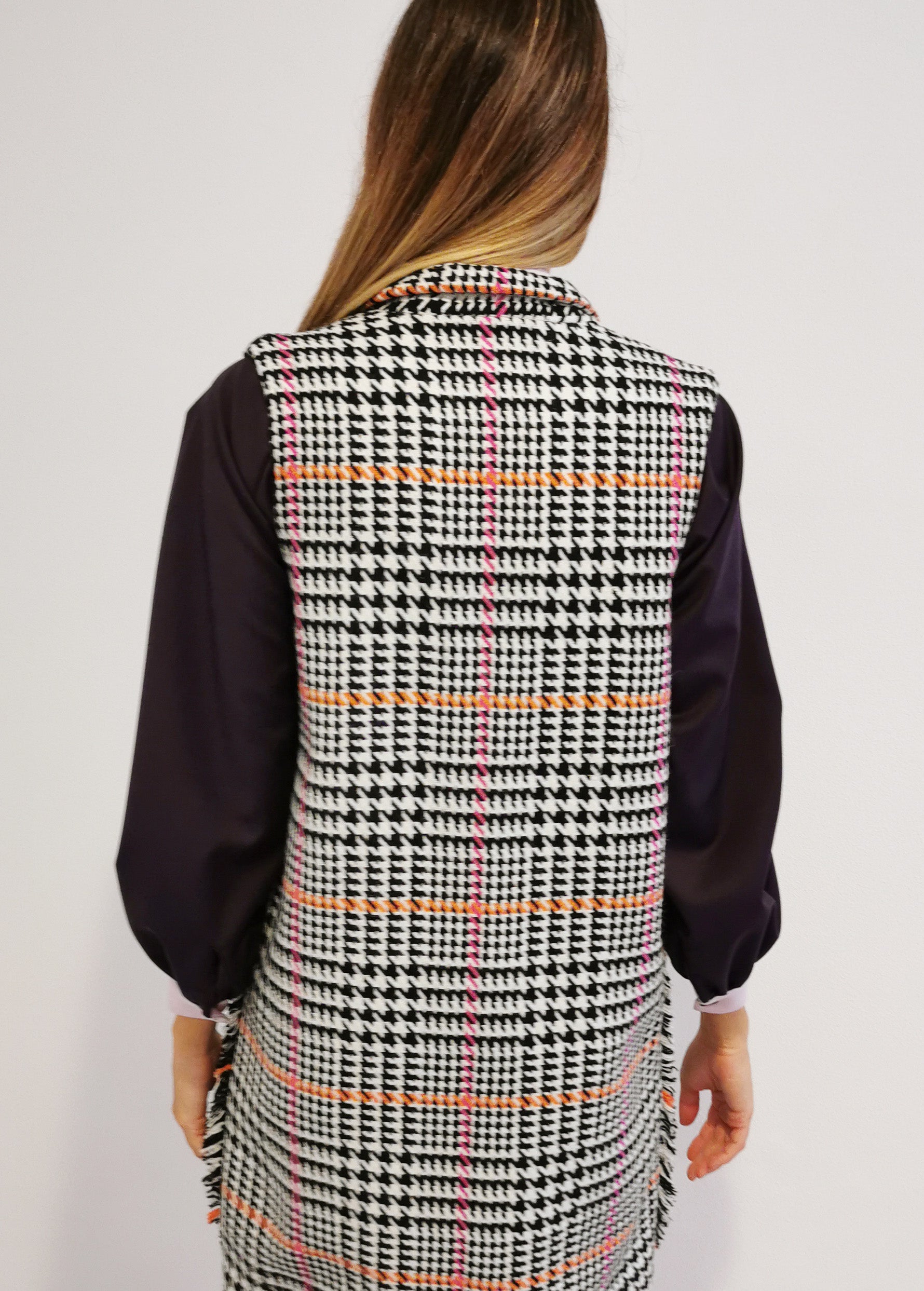 Gilet in lana con frange laterali e tasche interne. Fodera interamente dipinta a mano.