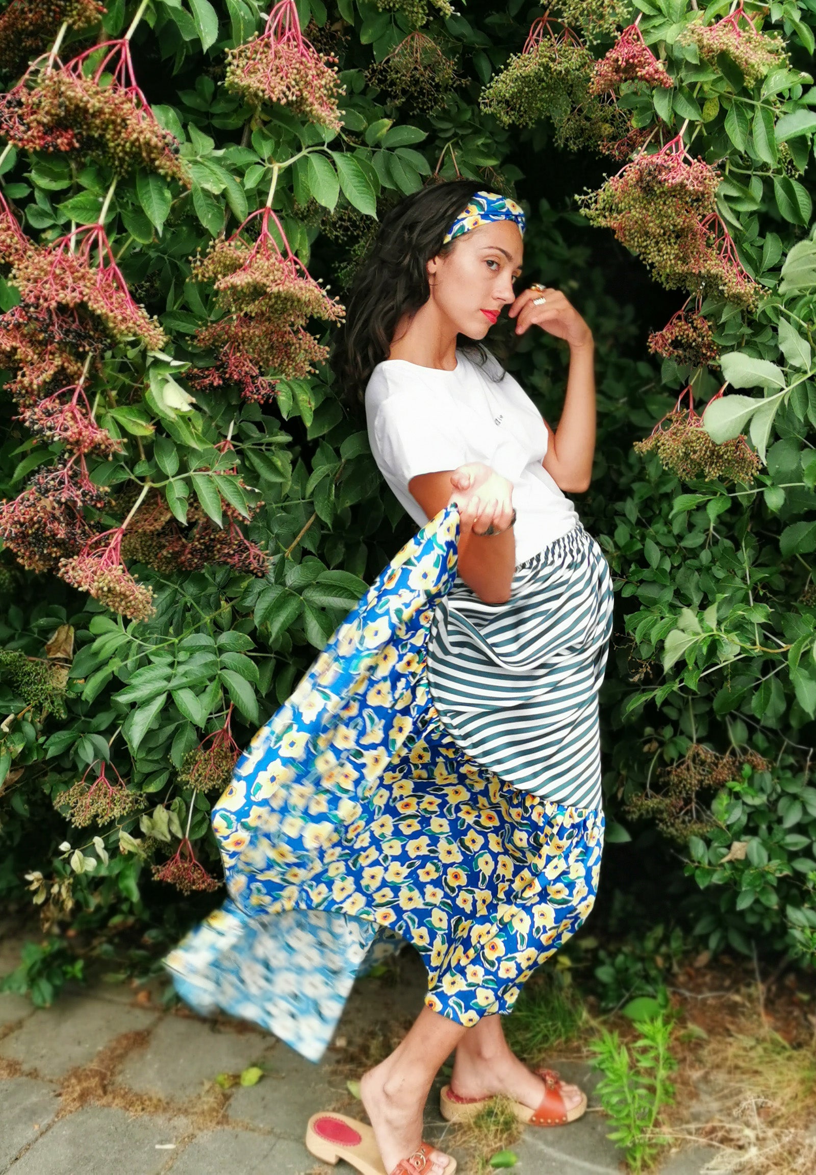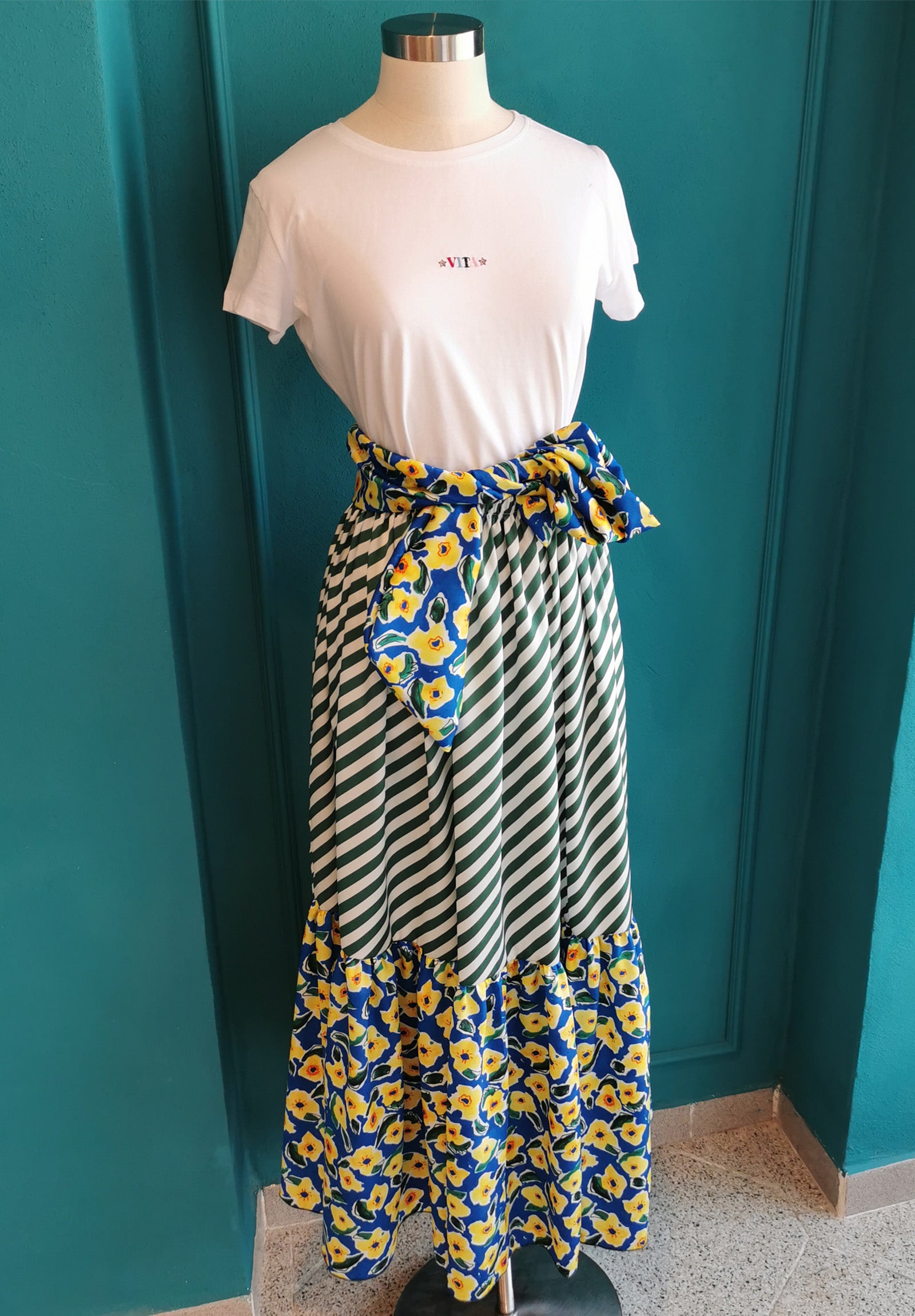 Gonna ampia con balza dal sapore etnochic. Particolare l'accostamento dei tessuti diversi delle due parti che compongono la gonna
