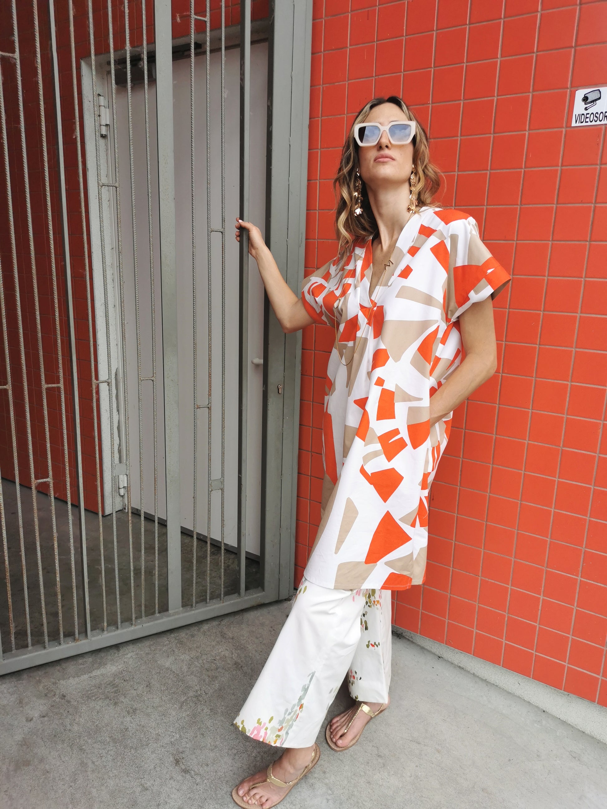 Descrizione: Long shirt dalla linea semplice e molto ben costruita. Particolari lo scollo a V sormontato collo alto, le maniche con bordo applicato e le tasche in cucitura