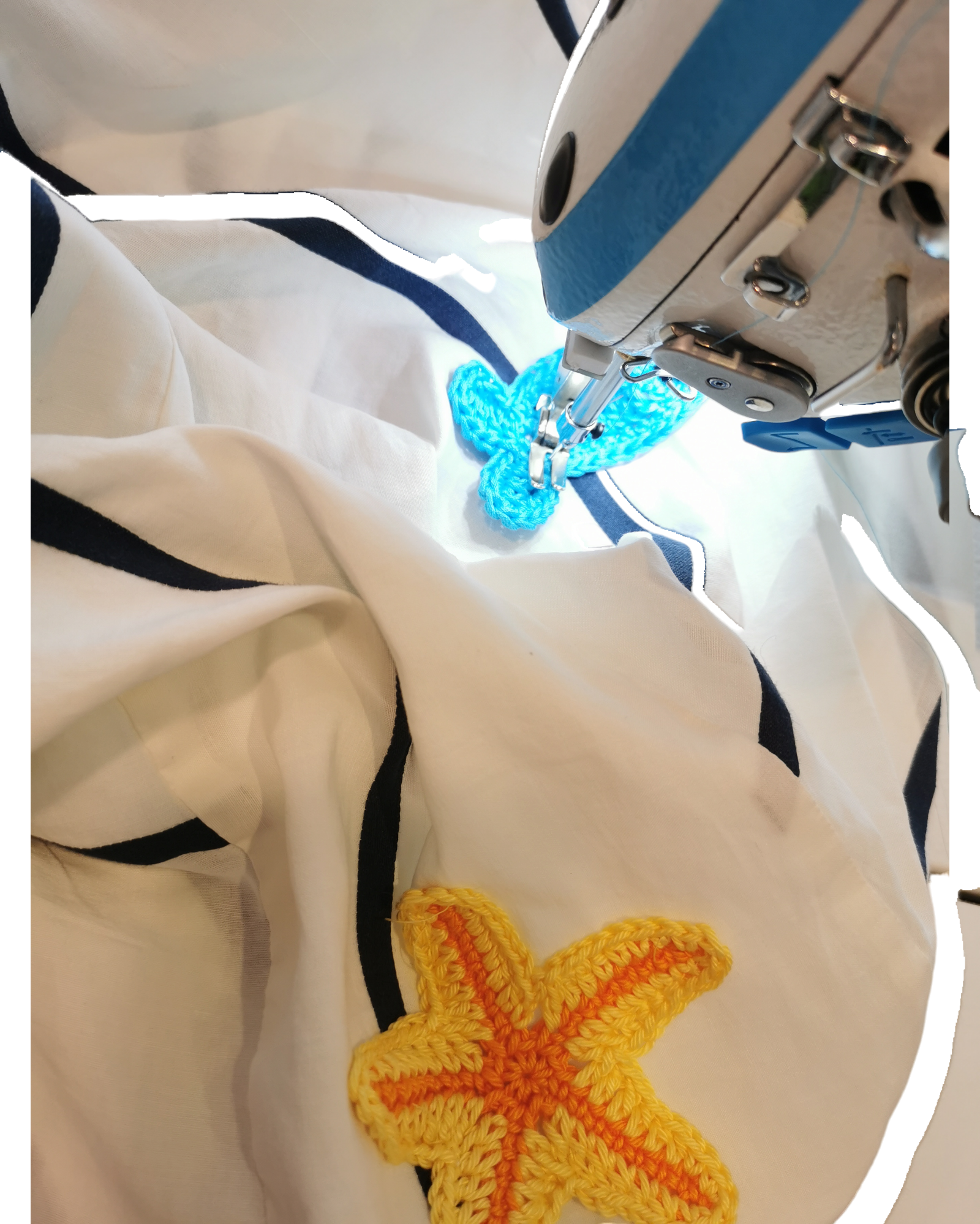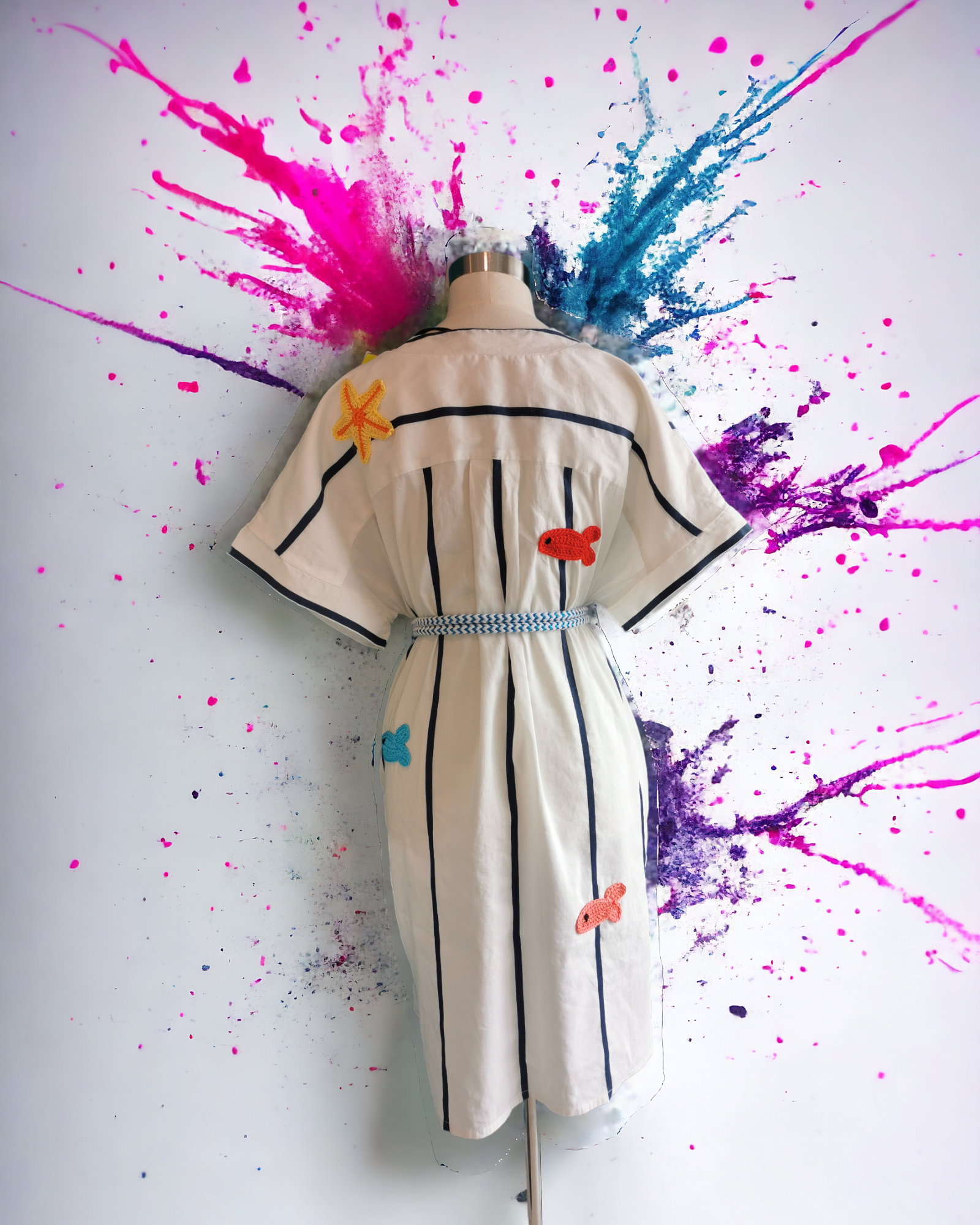 100% lino bianco a righe blu, applicazioni pesci colorati crochet in cotone