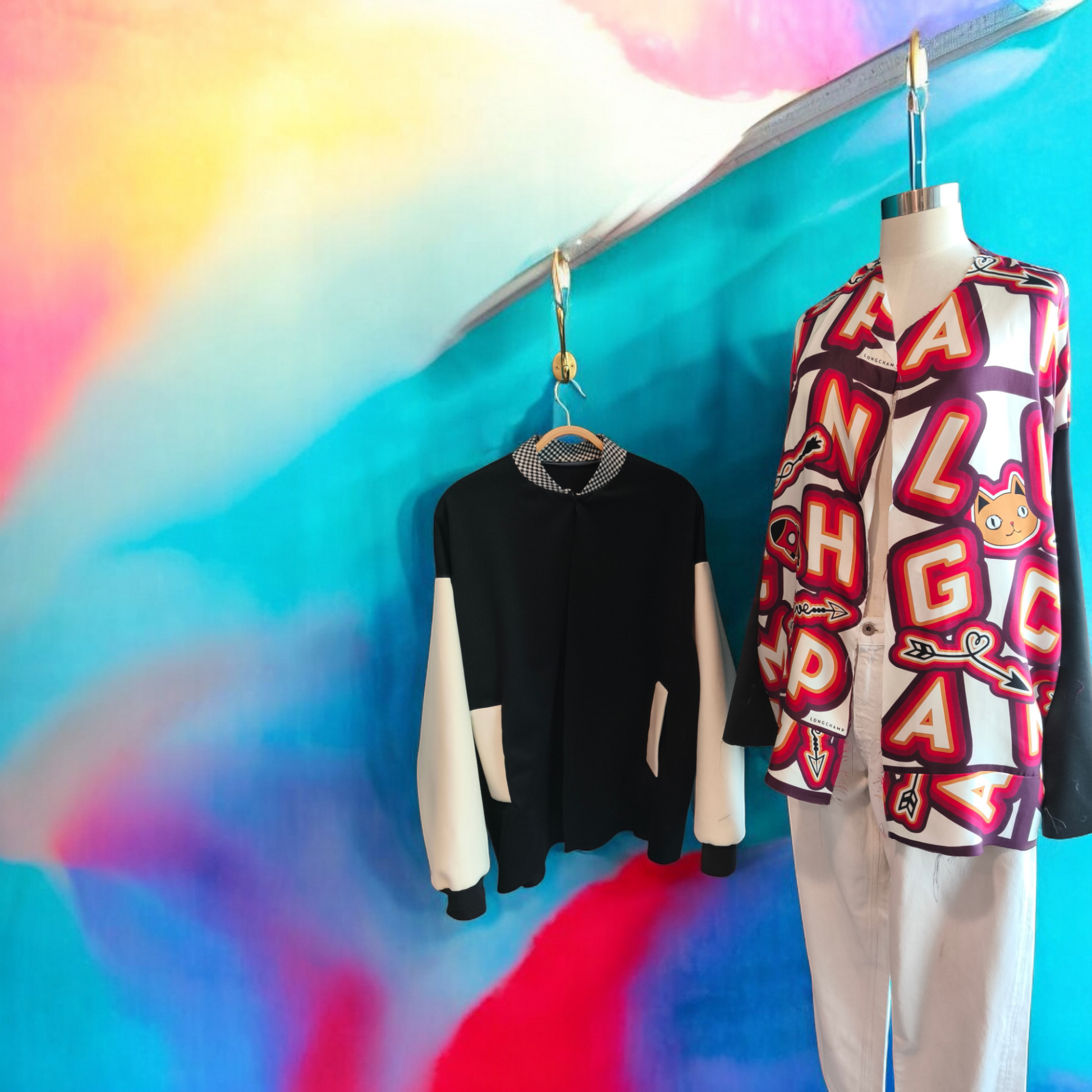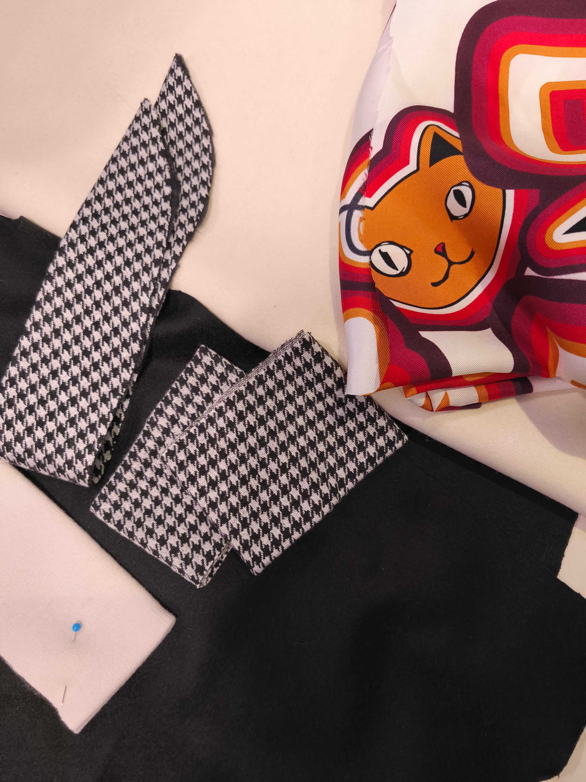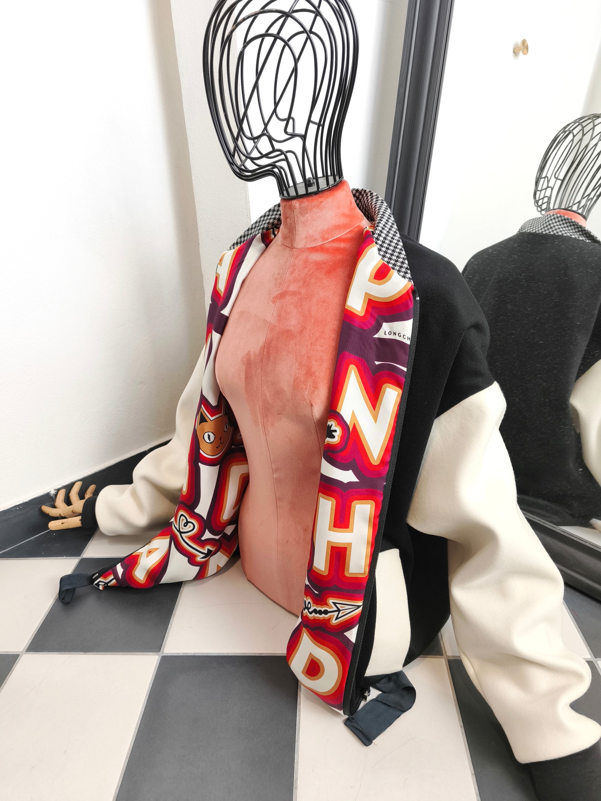 Questo pezzo unico è doubleface. Uno dei due lati realizzato in magnifico cachemire nero con maniche in lana bianca. Per l'altro lato, una seta fantasia con maniche nere in lana. Maglina pied de poule a contrasto per il collo.