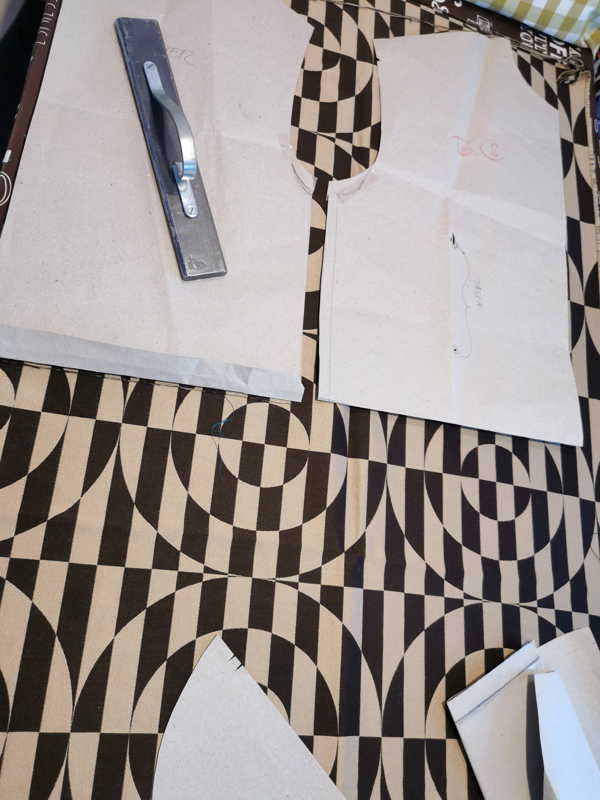 Questo pezzo unico è realizzato in cotone fantasia geometrica con interno in viscosa