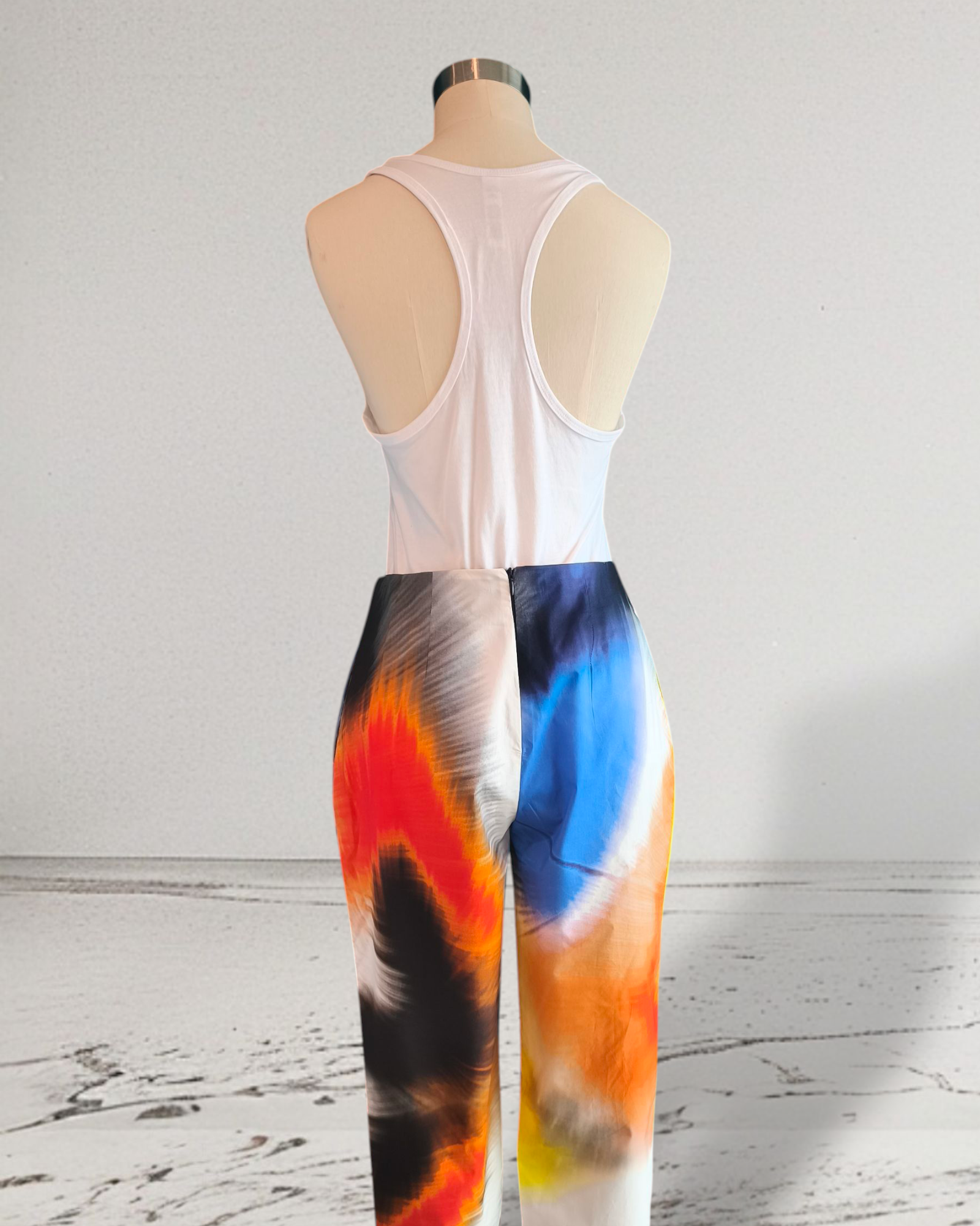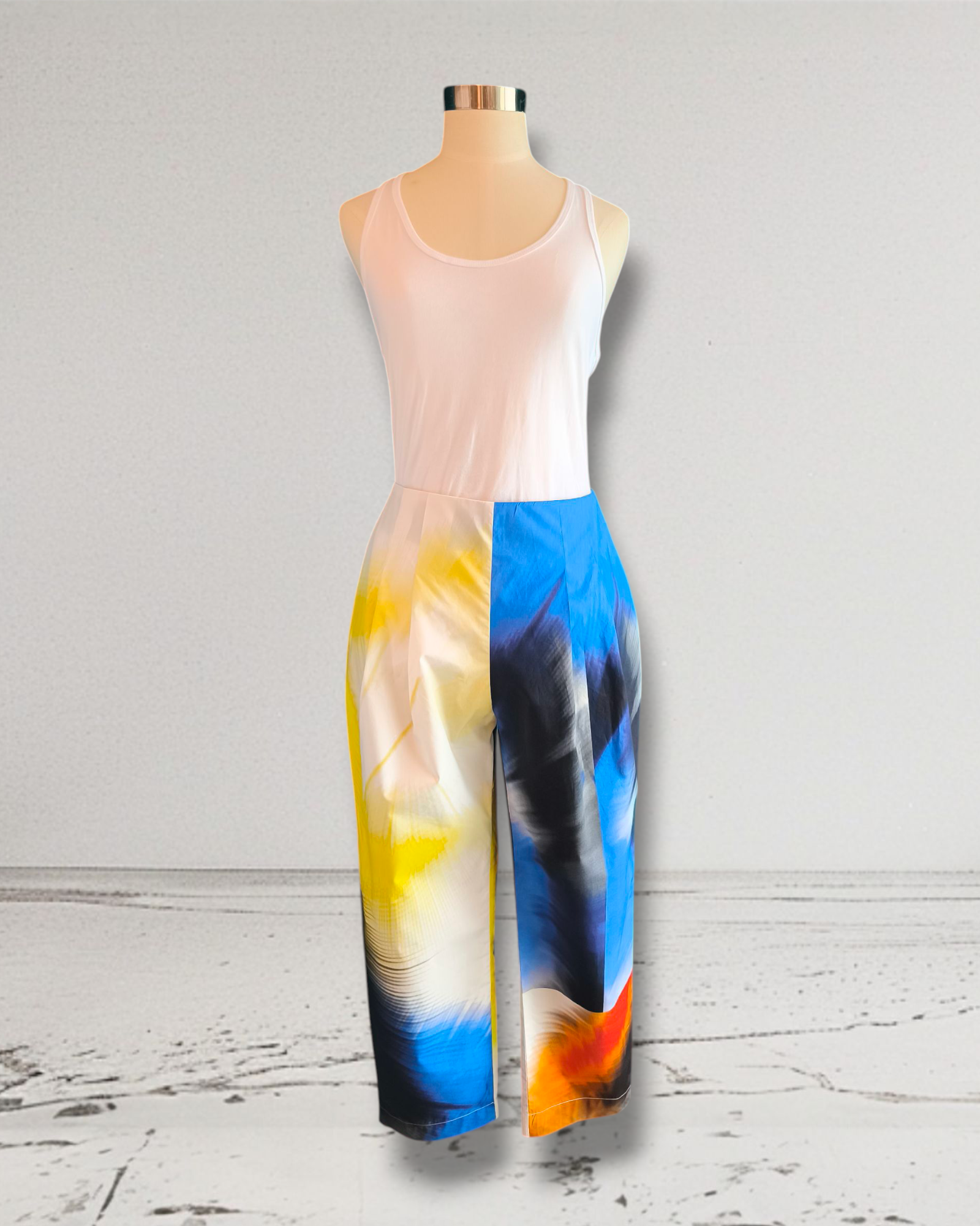 Pantalone sartoriale in cotone fantasia con pieghe ampie sul davanti e pinces dietro. Vita media con cerniera invisibile sul dietro al centro. Tasche laterali. Gamba a pallocino.