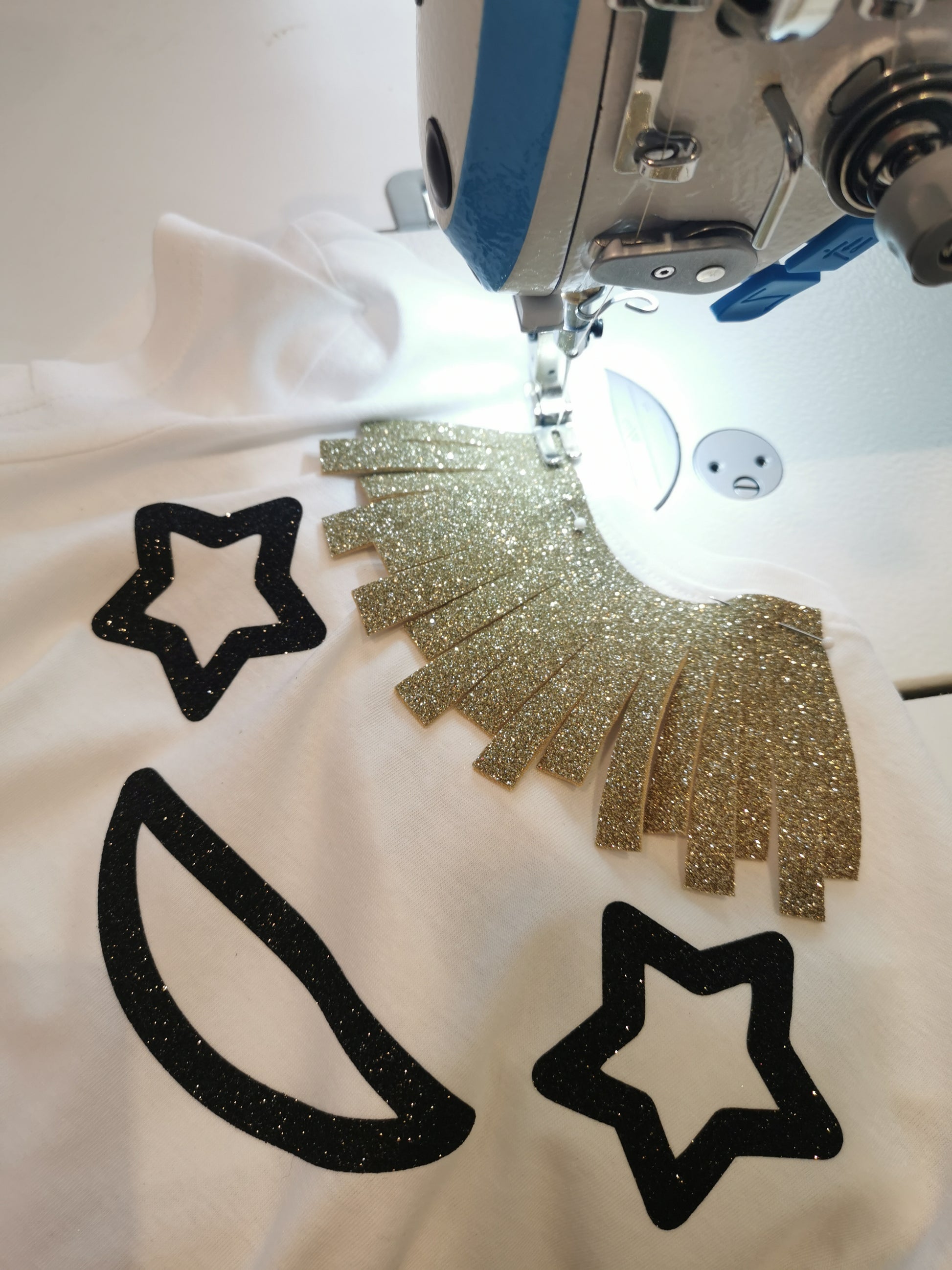 Applicazione di frangia sartoriale in tessuto scuba glitter oro lavabile
